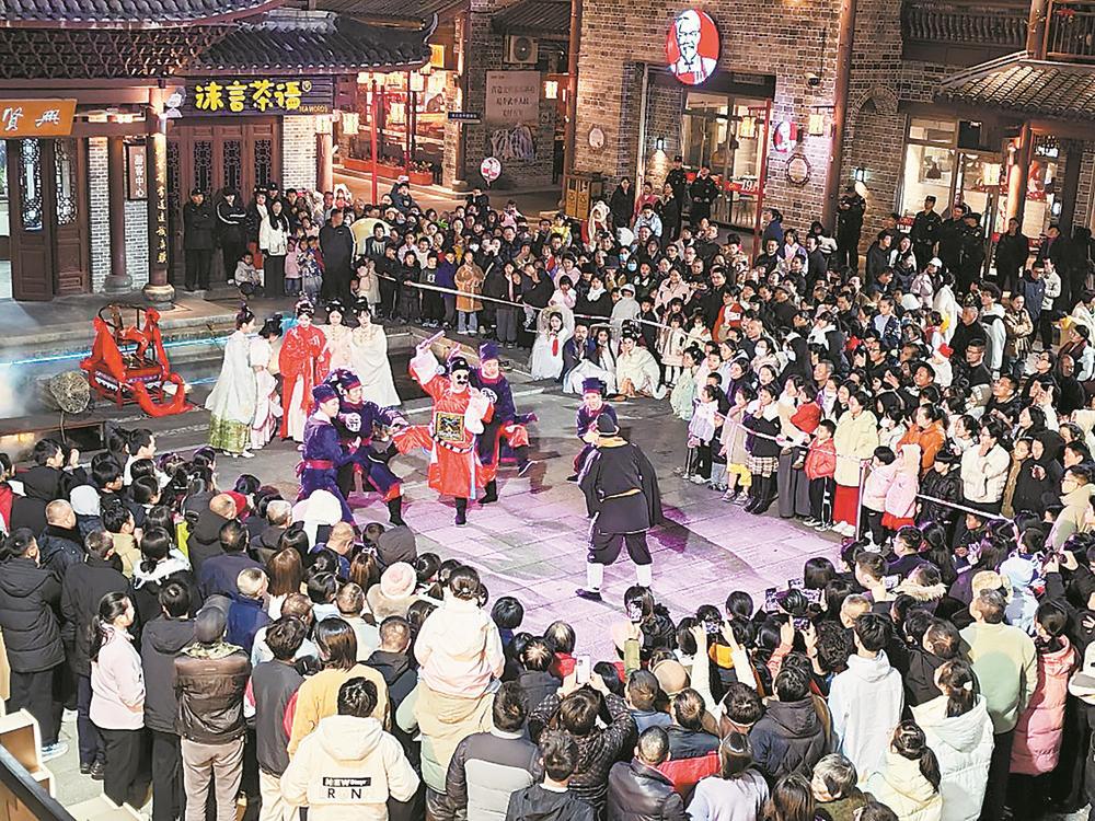 元旦期间的兴贤坊传统文化街区内处处是景,步步有戏。古风仕女、书生、乐师、轿夫与游客同行巡游,现场弹奏的古筝、二胡让人有穿越之感。这些实景演出既丰富了市民游客的假日精神文化生活,也让传统文化元素在沉浸式体验中焕发生机。