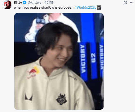 虎扑10月18日讯 前LPL英文流解说Kitty发文整活:当你意识到shad0w是欧洲人时