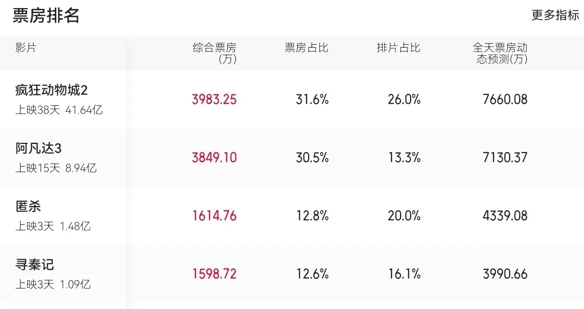 票房排在前两位的是上映了38天的《疯狂动物城2》和上映了半个月的《阿凡达3》。