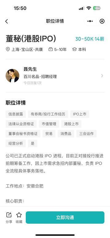 据其在BOSS直聘披露的招聘信息,百川名品已正式启动港股IPO进程,目前正对接投行推进上市前期筹备工作,现阶段因上市需求急招内部董秘,负责IPO全流程具体事务落地。